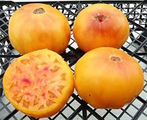 Плоды - двухцветные бифштексы, с розовым румянцем на блестящей оранжевой поверхности, мясистые, достаточно сочные, многокамерные, превосходно сладкие на вкус. Масса плодов 180 - 500 г. Кусты высотой до 1,8 м. Урожайный, среднеспелый сорт. При более прохладной погоде повышается завязываемость плодов.