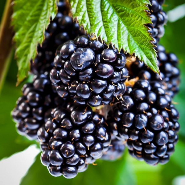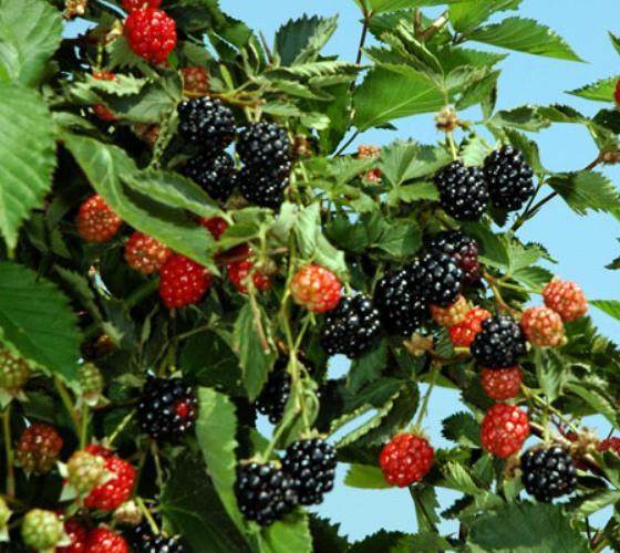Ягоды черные, блестящие, довольно крупные - достигают 6 - 7 г и не мельчают до конца сезона. Плотные и сочные плоды отличаются также оригинальным вкусом: отмечено вишневое послевкусие со смородиновыми нотками. Семена сравнительно небольшие. Ягоды не теряют товарных качеств при длительном (неделя и больше) хранении. Урожайность составляет около 30 кг с одного куста. Это одно из главных достоинств сорта. Плодоношение продолжительное, начинается в середине июня и длится еще два месяца, что, вероятно, является рекордом для бесшипных садовых сортов ежевики. Такой сорт идеально подходит для дачных или приусадебных участков. Отличительной особенностью сорта является качество его побегов. Они длинные, крепкие, выдерживают нагрузку плодов без опор, но в то же время достаточно гибкие, что удобно для укрытия на зиму в северных регионах. Кроме того, у растения полностью отсутствуют шипы.