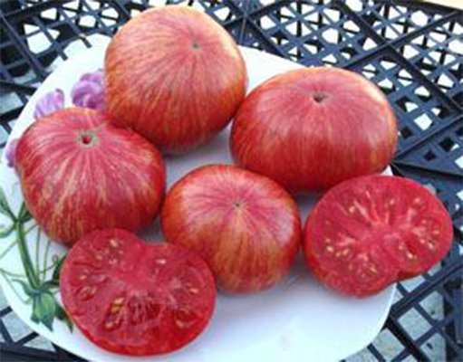 Плоды пестрые полосатые, плоско-округлые, плотные, достаточно мясистые, сочные, сладкие, вкусные. Масса плодов 100 - 200 г. Среднеспелый, высокоурожайный сорт. Кусты высотой до 1,5 м. Лист картофельный.