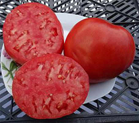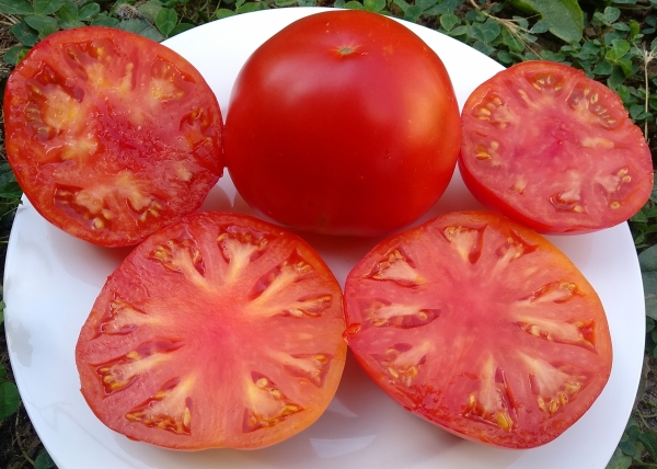 (Болгария) Плоды красные, округло-сердцевидные (сердечко не ярко выражено), с ребрышками у плодоножки, очень мясистые, многокамерные, одномерные, крупные. Мякоть сладкая, насыщенного красного цвета, отличная на вкус. Масса плодов 300- 600 г, отдельные - до 1 кг. Высокоурожайный сорт среднего срока созревания. Очень мощные кусты высотой до 1,8 кг.