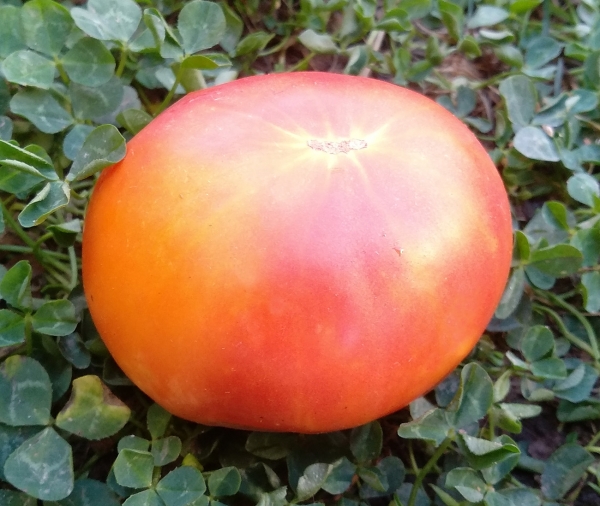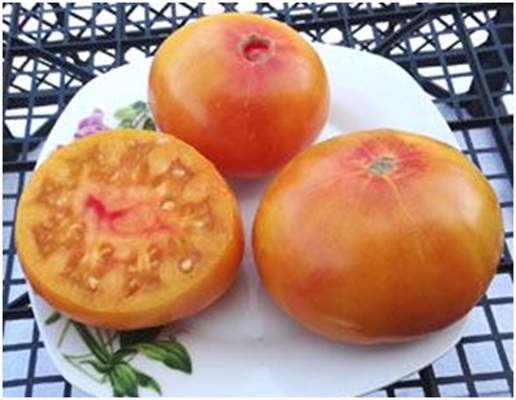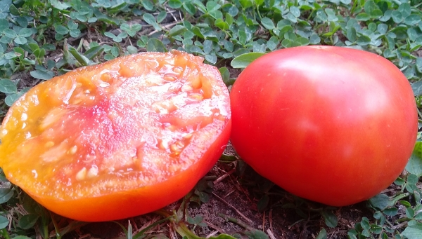Плоды плоско-округлые, оранжево-розовые, мясистые, многокамерные, Мякоть «мраморная», сочная, превосходная на вкус, очень ароматная. Среднеспелый, детерминантный, болезнеустойчивый сорт. Растения высотой до 1 м с морщинистыми простыми листьями. Урожайность выше средней.