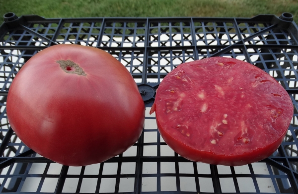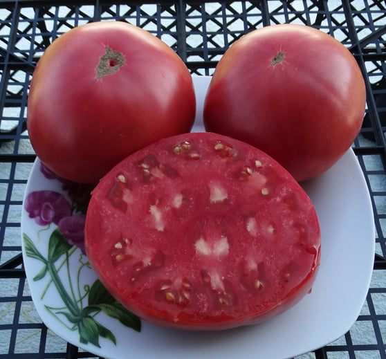 Сорт очень популярен во Франции. Плоды насыщенного розового цвета снаружи и внутри, плоско-округлые, с небольшими ребрышками у хвостика, мясистые, с гладкой кожицей, без трещин. Вкус богатый, с кислинкой и сладостью, с ароматом старинных помидоров. Очень красивые плоды-гиганты, с хорошей однородностью по размеру. Хорошо хранятся при комнатной температуре. Масса плодов 300 - 600 г и более. Среднеспелый сорт, практически иммунный к заболеваниям, очень урожаен в любом климате. Кусты высотой до 1,5 м.