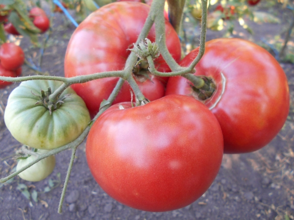 Семейная реликвия из Германии. Очень популярный сорт, известный своим богатым вкусом. Плоды розового цвета, плоско-округлые, упругие, мясистые, сочные, обладают удивительно богатым, хорошо сбалансированным вкусом. Масса плодов 250 - 600 г. Среднеспелый, высокоурожайный сорт. Кусты высотой до 1,8 м, с крупными картофельными листьями.