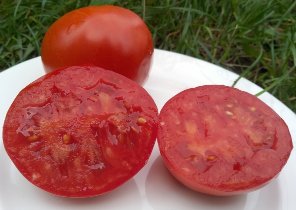 Плоды ярко-красные, плоско-округлые, равные по размеру, не растрескиваются. Масса плодов до 200 - 250 г. Мякоть плотная, мясистая, хороша на вкус. Высокоурожайный среднеспелый сорт. Кусты высотой 60 - 80 см.