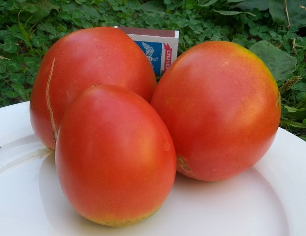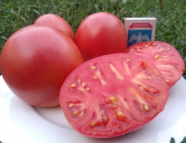 Плоды сердцевидной формы, темно-красные. Мякоть зернистая, сладкая, очень вкусная, на разрезе красная с малиновыми лучами. Масса плодов 300 - 600 г. Высокоурожайный средне-ранний сорт. Кусты высотой до 1,8 м.