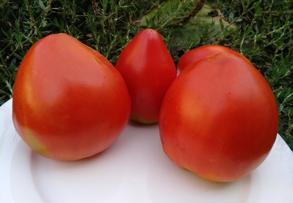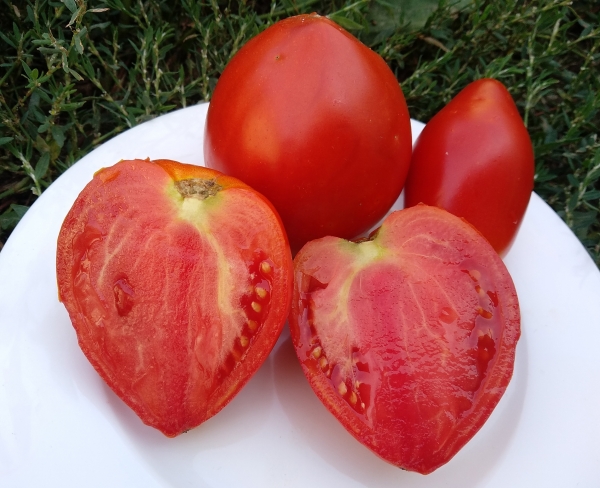 (США) Плоды красного цвета, вытянутой сердцевидной формы, с темно-зелеными плечиками, которые исчезают при созревании, мясистые, сочные, вкусные. Масса плодов 300 - 400 г. Высокоурожайный сорт средне-раннего срока созревания. Кусты высотой до 1,8 м, с тонкой листвой.