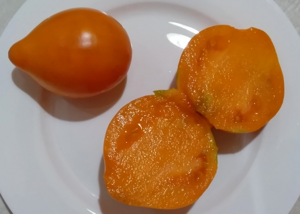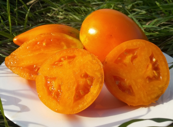Плоды удлиненные или удлиненно-сердцевидные, насыщенного желто-оранжевого цвета, мясистые, сладкие. Масса плодов 150 - 300 г. Очень урожайный сорт среднего срока созревания. Кусты высотой до 1,8 м.