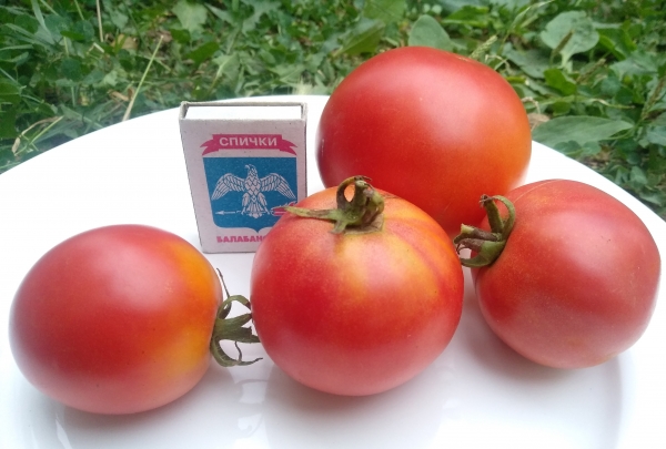 Плоды округлой или плоско-округлой формы, розовые, без зелёного пятна у плодоножки, нежные, вкусные и ароматные. Масса плодов 150 - 200 г. Урожайный среднеранний сорт, устойчивый к заболеваниям. Кусты высотой до 70 - 80 см.