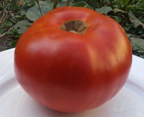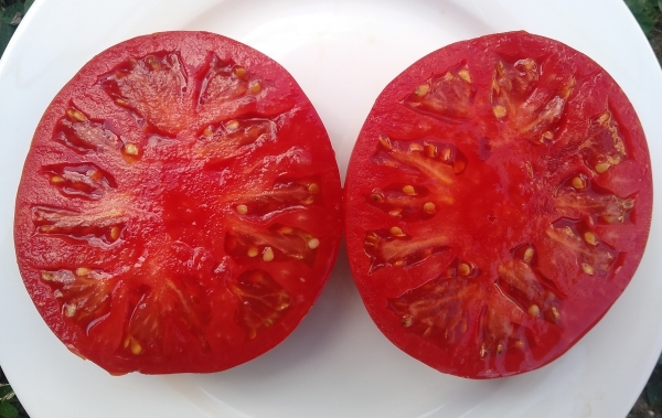 Плоды красные, плоско-округлые, с небольшими ребрышками, мясистые, сладкие. Масса плодов от 300 г. Но чтобы получить плоды до 1 кг, урожай на кустах следует нормировать. Высокорослый среднеспелый сорт. Кусты высотой 1,5 - 1,8 м.