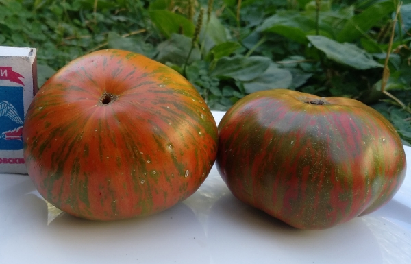 Плоды тёмные красно-коричневые, покрыты зелёными серебристыми полосками, сладкие и сочные. Масса плодов 300 - 500 г. Мякоть малиновая, очень вкусная. Урожайный, среднеспелый сорт с длительным периодом плодоношение и устойчивостью к заболеваниям. Кусты высотой 1,8 - 2 м.
