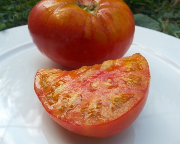 Плоды плоско-округлые, оранжево-розовые, мясистые, на вкус насыщенно сладкие. Мякоть плотная. Высокоурожайный среднеспелый сорт. Кусты высотой до 1,8 м.