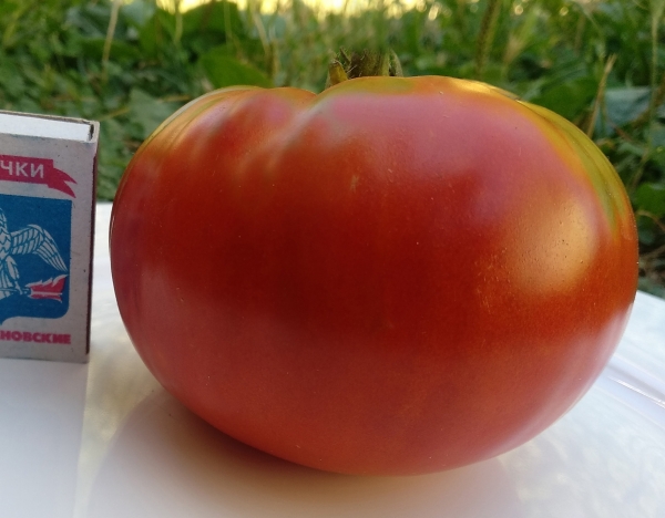 (США) Плоды - огромные красные ребристые бифштексы, мясистые и вкусные, малосеменные. Масса плодов 300 - 800 г. Мякоть плотная. Урожайный высокорослый среднеспелый сорт. Кусты относительно компактные, с тонкой листвой.