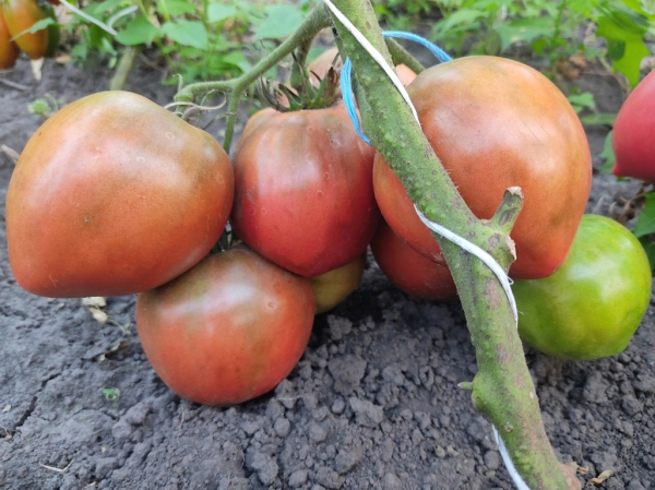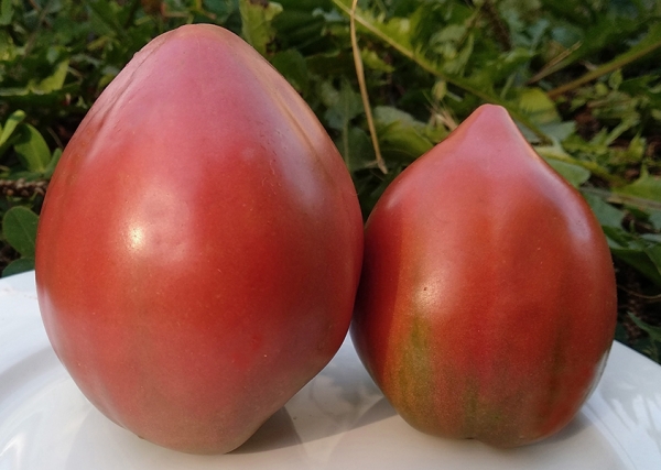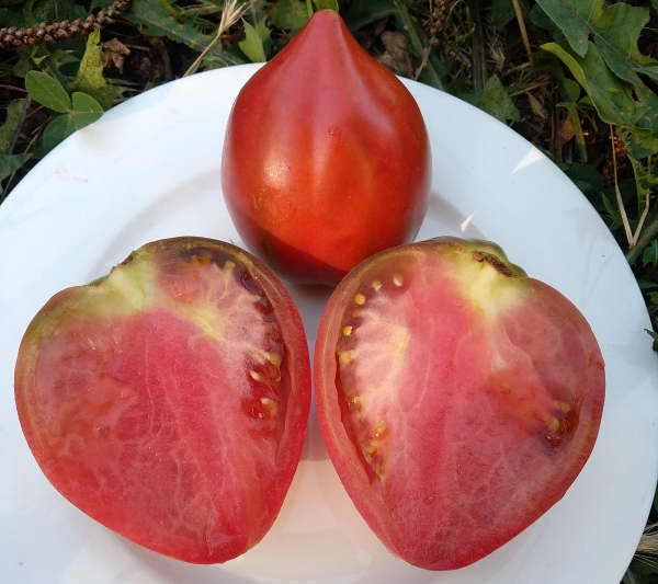 (США) Плоды удлиненные сердцевидные, фиолетово-розовые с оливковыми плечами, плотные, мясистые, малосеменные. Масса плодов 200 - 350 г. Мякоть красно-пурпурная, сладкая, вкусная. Высокоурожайный, высокорослый, ранний сорт, довольно нетребовательный. Кусты высотой до 1,5 м.