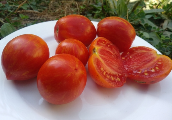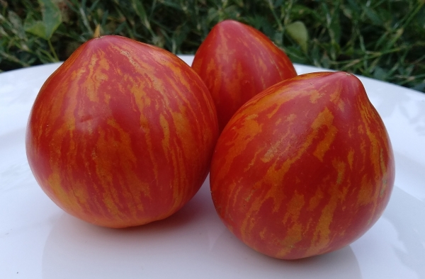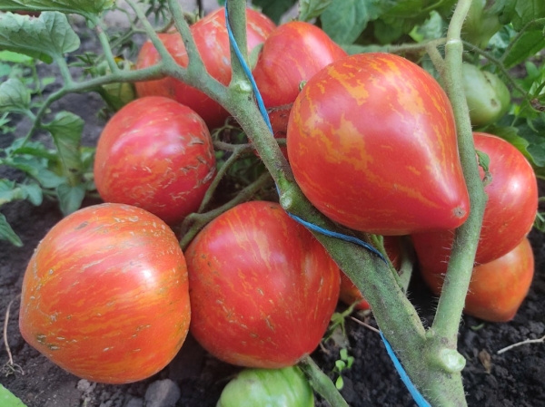 Плоды сердцевидной формы, алые с золотыми полосками, мясистые, малосеменные, имеют насыщенный сбалансированный вкус. Масса плодов 100 - 200 г. Высокоурожайный раннеспелый сорт. Растения высотой 1 - 1,2 м, с крупными морщинистыми листьями. При выращивании в горшках высота растений может быть до 0,7 м.