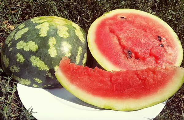 Плоды широкоовальные, крупные, с полосками по поверхности. Мякоть плодов красно-розовая, нежная, сахаристая, с отличными вкусовыми качествами. Плоды транспортабельные, могут храниться до 45 дней. Высокоурожайный скороспелый сорт. На растении формируется 3 - 4 плода. Толерантен к настоящей и ложной мучнистой росе. Устойчив к слабовирулентным расам антракноза.