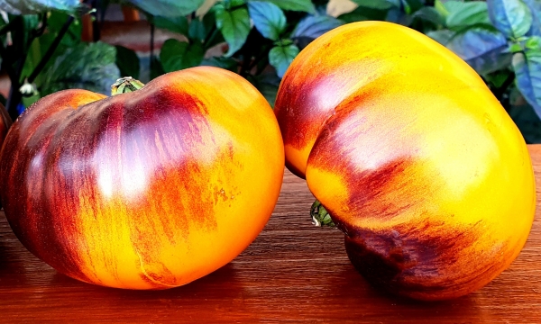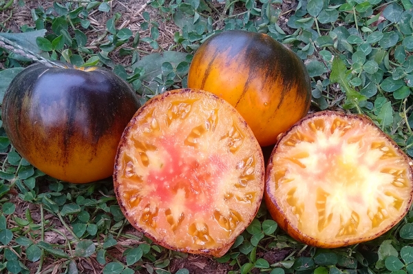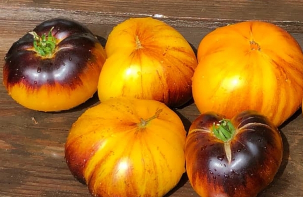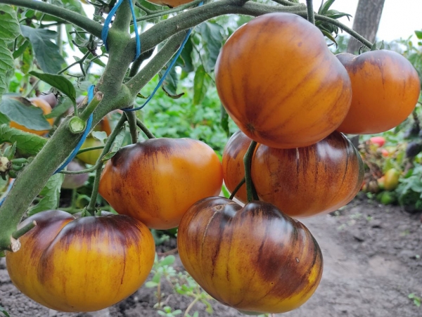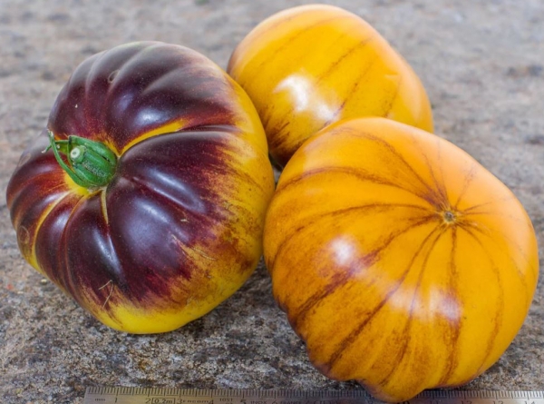 Новинка! Плоды плоскоокруглые, желтые с антоциановыми полосами, мясистые, сочные, на вкус сладкие, с сильным томатным ароматом. Масса плодов 250 - 350 г. Очень урожайный сорт среднего срока созревания. Кусты высотой до 1,5 м.
