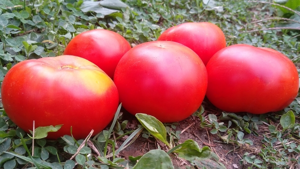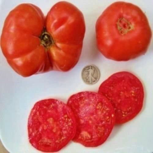 Старинная семейная реликвия. Плоды плоско-округлые, красные, мясистые, вкусные, сладкие, без пятен. Масса плодов 150 - 400 г. Высокоурожайный, среднеспелый, среднерослый сорт. Кусты высотой до 1,5 м, с картофельными листьями.