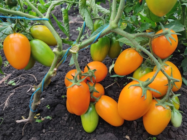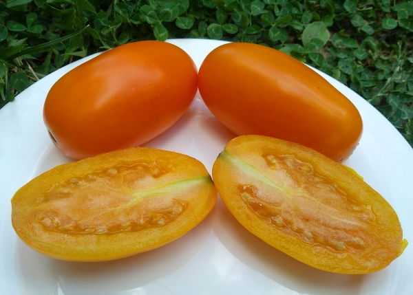 Новинка! Плоды – удлиненные оранжевые сливки, плотные, гладкие. Масса плодов 100 – 150 г. Мякоть густая, вкусная, сладковатая. Плоды подходят как для свежего потребления, так и для цельноплодного консервирования. Кожица тонкая, но в банках не трескается. Высокоурожайный, среднеранний, кистевой, детерминантный сорт. В открытом грунте кусты высотой около 0,6 метра.