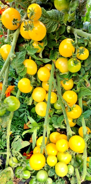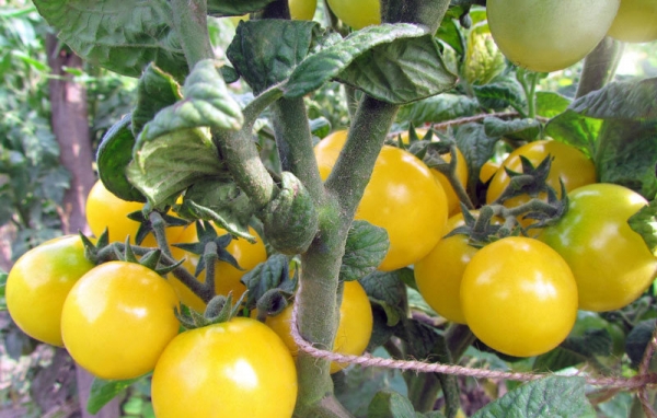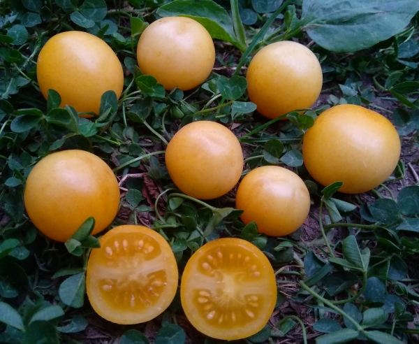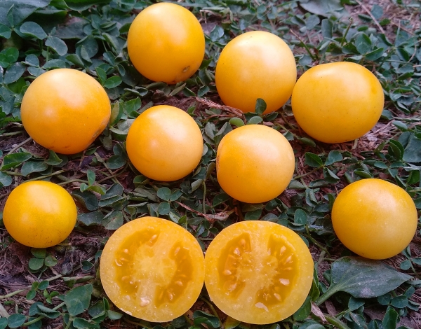 Новинка! Плоды - круглые, светло-жёлтые черри, сладкие на вкус. Масса плодов 10 – 20 г. Плоды отлично подходят для приготовления салатов и закусок. Очень урожайный среднеранний сорт. Кусты высотой 70 - 80 см, с пышной морщинистой листвой картофельного типа.