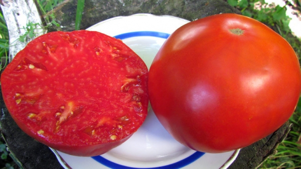 (Франция) Плоды насыщенного красного цвета, плоско-округлые, с небольшими рёбрышками, мясистые и сочные, ароматные, вкусные. Масса плодов 300 – 500 г. Плоды прекрасно подходят для еды, бутербродов и салатов. Урожайный, среднеспелый сорт. Кусты высотой до 1,8 м.