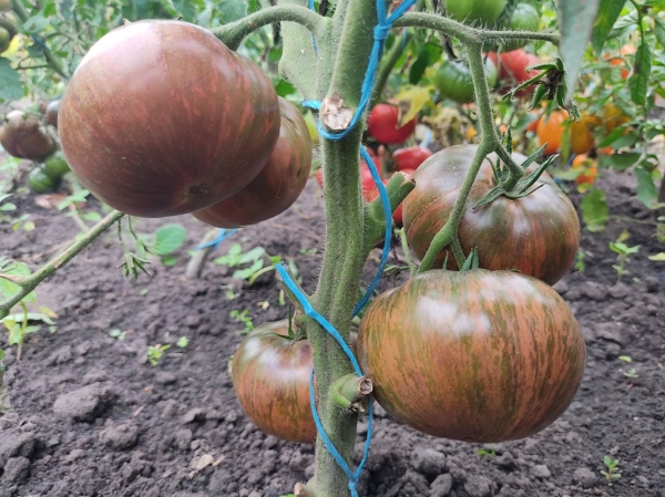 Новинка! Новый сорт Брэда Гейтса, родительские сорта Berkeley Tie Dye Pink и Blue Beauty. Плоды плоскоокруглые и слегка сердцевидные, слаборебристые, сложно окрашены: смесь зеленых, красных, коричневых и оливковых штрихов, плечики с антоцианом. Масса плодов 160 - 390 г. Мякоть сочная, ароматная, малиново-бордовая, отсюда и название сорта. На вкус сладкие с кислинкой. Достаточно урожайный среднеспелый сорт. Кусты высотой 1,3 - 1,7 м.
