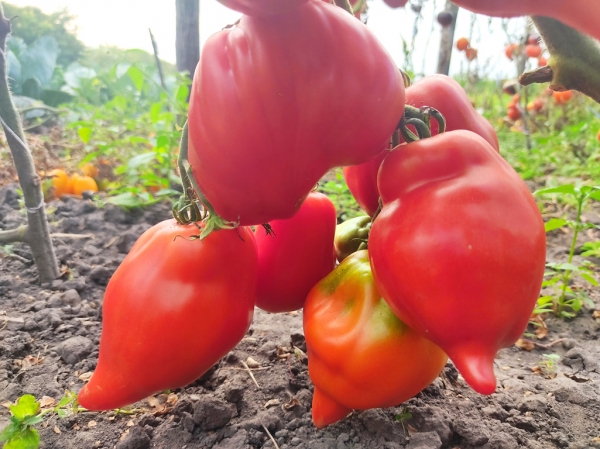 Новинка! Плоды ярко-красного цвета, сливовидные, рифленые, почти все с загнутым носиком, довольно мясистые, но и сочные, внутри иногда бывают полости, вкусные, сладкие с легкой кислинкой. Масса плодов 120 - 350 г. Плоды не склонны к растрескиванию, могут долго храниться. Прекрасно подходят для салатов, соусов, заправок и аджики. Очень урожайный, среднеспелый сорт. Кусты крепкие, высотой 1,5 - 1,8 м.