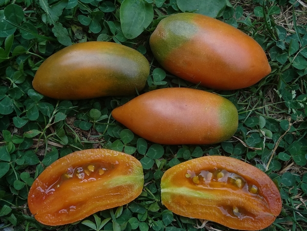 Новинка! Сорт создан Шерри Лонг (Sherry Long), скрещиванием Orange Banana с одним из сортов проекта Dwarf tomato. C сортом также работали Крейг Леулье (Craig LeHoullier), Сьюзен Оливерсон (Susan Oliverson) и Билл Минки (Bill Minkey). Плоды удлиненные, сливовидные, цвета охры, зеленоватые, крепкие. Масса плодов 70 - 140 г. Мякоть пастообразная, с идеально сбалансированными вкусовыми качествами. Урожайный среднеспелый сорт. Кусты высотой около 70 см.
