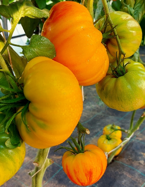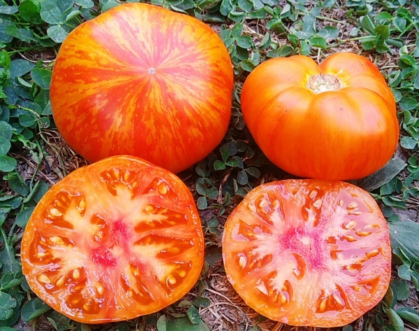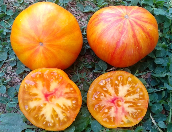 Новинка! Плоды - плоскоокруглые биколоры: на желто-оранжевом фоне красные лучики и штрихи, вкусные. Масса плодов 200 – 300 г. Урожайный среднеспелый сорт. Кусты высотой до 1,2 м. Сорт новый, возможны расщепления.