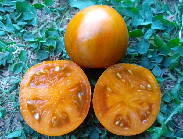 Новинка! Один из сортов линии "Kiwi", полученный скрещиванием "Dino Eggs" с F2 из линии «Lazy». Плоды оранжевого цвета с зелеными полосками, круглые, со сбалансированными вкусовыми качествами. Масса плодов 60 - 120 г. Урожайный среднеспелый сорт. Растения высотой до 1 м, с морщинистыми обычными листьями.