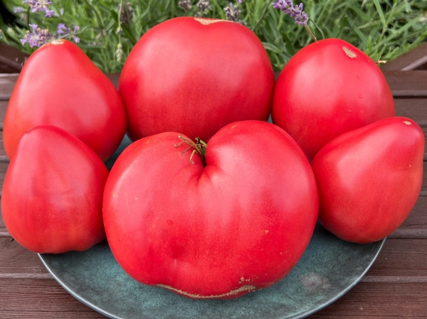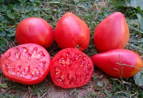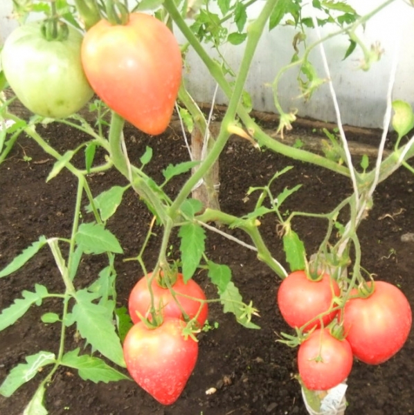 Новинка! Плоды сердцевидные, розовые, мясистые, сладкие. Мякоть плотная, нежная. Масса плодов 250 - 400 г. В кисти 3 - 4 плода. Высокоурожайный средне-ранний сорт. Кусты высотой до 1,5 м. Тонкий поникший лист. Плоды подходят для нарезки и свежего потребления, салатов, зимних заготовок, соков, соусов и паст.