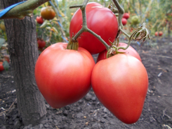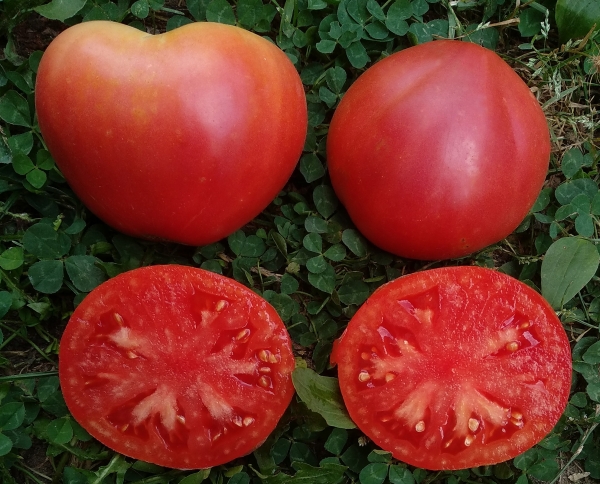Новинка! Старинный сорт из России. Плоды сердцевидные, малиново-розового цвета. Кожица тонкая. Мякоть плотная и сочная, сахаристая на изломе, сладковатые на вкус. Масса плодов 500 - 800 г. В кисти до 9 плодов. Очень урожайный, среднеспелый сорт. Кусты высотой до 1,8 – 2 м.