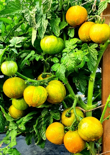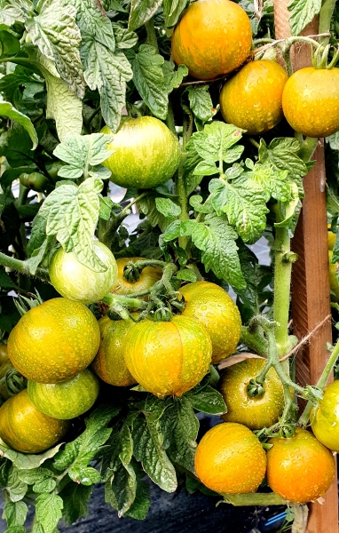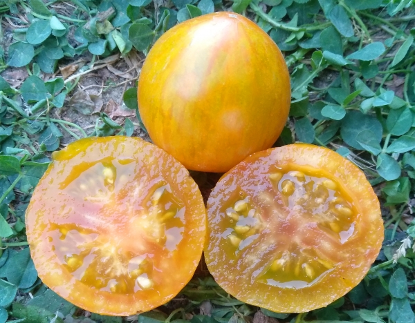 Новинка! Cорт из линии Киви, полученной путем скрещивания Dino Eggs с селекцией F2 от Lazy Family (Kangaroo Paw Brown F4 x Purple Russian), созданной Винсом Лавалло. Плоды круглые или слегка сердцевидные, желтого цвета с янтарными, светло-зелеными и оранжевыми полосками. Масса плодов 60 - 120 г. Мякоть желтого цвета, очень сочная, сладковатая на вкус. Высокоурожайный среднеранний сорт. Растения компактные, высотой до 1 м, с обычными морщинистыми листьями. Можно выращивать в больших горшках.