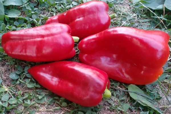 Новинка! Плоды насыщенного красного цвета, конусовидные, сплющенные, длиной до 15 см. Масса плодов 100 - 200 г. Стенки толщиной до 12 мм, сочные, сладкие, ароматные. Среднеспелый сорт. Кусты крепкие, высотой до 60 - 70 см, неприхотливые, стрессоустойчивые и холодостойкие.