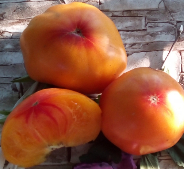 Новинка! Плоды плоско-округлые, слегка ребристые, желто-оранжевые, с красными разводами. Мякоть желтая, с ярко-красной сердцевиной, плотная, с мелкими семенными камерами, на вкус сладкая, с пряными нотками. Масса плодов 280 - 350 г. В кистях по 4 - 5 плодов. Кусты высотой до 1,3 м. Урожайный ранний сорт.