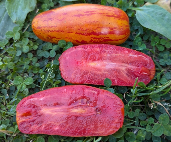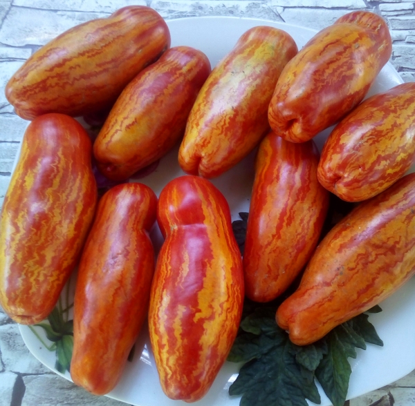 Новинка! Плоды банановидные, пестрые: красные с желто-оранжевыми мраморными полосами, приятные на вкус, кисло-сладкие. Стенки плодов упругие, сочные, толстые. Масса их - 60 - 80 г. Плоды растут кистями по 5 - 7 штук. Даже недозревшие они красивы. Кусты в закрытом грунте до 1,5 м. Сорт среднеспелый, с длительным периодом плодоношения.