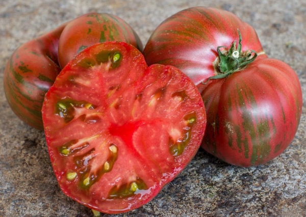 Новинка! Плоды шоколадного цвета с зелеными и фиолетовыми полосами, ароматные, превосходные на вкус. Масса плодов 150 - 250 г. Они растут кистями, от трех до пяти штук. Растения высотой 0,8 - 1 м, с простыми морщинистыми листьями. Можно выращивать в больших контейнерах. Высокоурожайный ранний сорт.