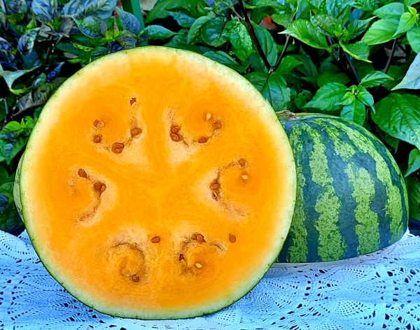 Новинка! Майк Кессел (эксперт по арбузам из округа Лиланау, штат Мичиган) скрестил сорта арбузов Orangeglo и Crimson Sweet. Плоды круглые, зеленые, с темно-зелеными полосками. Мякоть оранжевого цвета, сладкая. Масса плодов 4 - 6 кг. Среднеранний сорт, подходит для выращивания в довольно холодных областях.