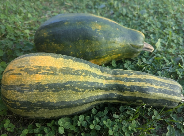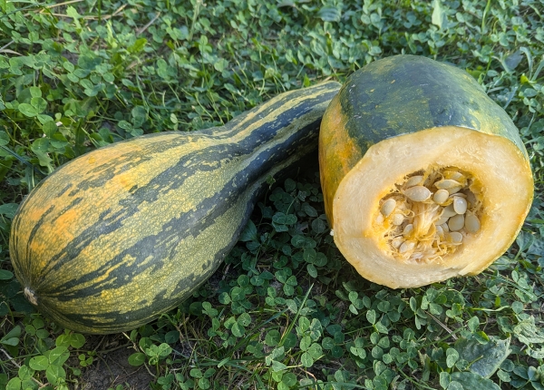 Новинка! Гибрид желудевой и мускатной тыквы. Плоды удлиненные, тёмно-зелёные, при полном вызревании и длительном хранении становятся оранжевыми с зелеными полосками. Мякоть желтая, вкусная, без запаха, поэтому в блюдах может заменять картофель, особенно хороша запеченной. Возможна нестабильность формы. Плети короткие.