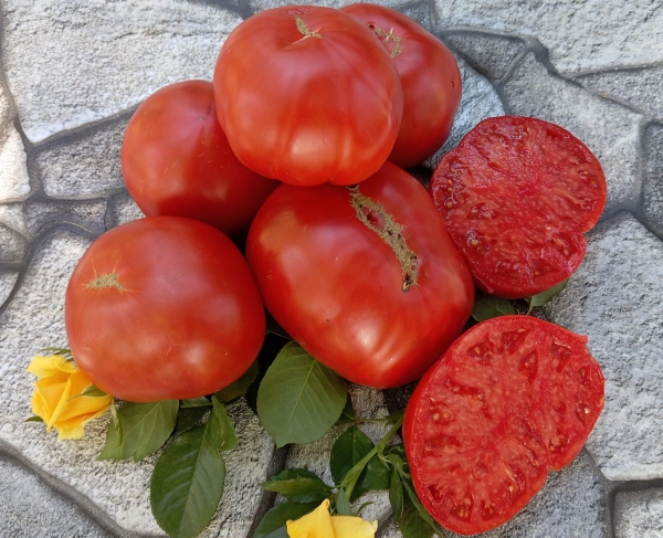 Новинка! (Румыния) Старинный семейный сорт. Выращивается в селении Ваца де Жос в окрестностях Девы. Плоды алые, плоско-округлые, с ребрышками у плодоножки, малосеменные. Мякоть малиново-красная, маслянистая, по вкусу похожа на старинные помидоры. Масса плодов 250 - 500 г. Высокоурожайный устойчивый среднеспелый сорт. Кусты высотой до 2 м.