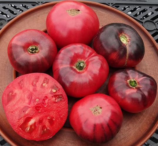 Новинка! (США) Сорт селекционеров Гэри и Жозефин Касс. Это отбор из сорта Siberian Tiger, с более выраженными антоциановыми полосами и немного другого цвета. Плоды плоско-округлые, фиолетово-розовые, с темными плечиками и разводами, сладкие на вкус. Масса плодов 140 - 250 г. Высокоурожайный, среднеспелый сорт. В кистях по 12 плодов. Кусты густые, болезнеустойчивые, высотой 1,2 - 1,5 м, с темно - зеленой листвой.