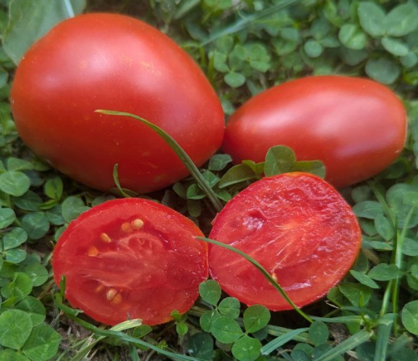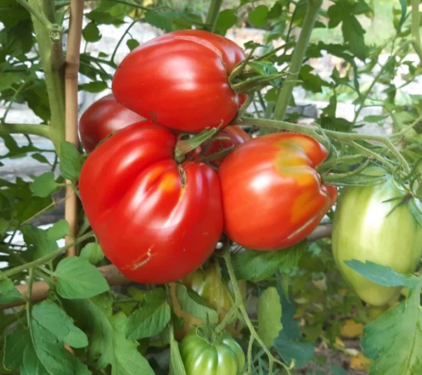 Новинка! Плоды красные, вытянутые, овальные или сливовидные, мясистые. Масса плодов 150 - 300 г. Мякоть малиновая, сочная, сладковатая. Кисти крупные. Урожайный среднеспелый сорт, с длительным периодом плодоношения. Кусты высотой до 1,5 м, в теплице – до 1,7 м. Плоды подходят для консервирования, салатов, соусов, сока.