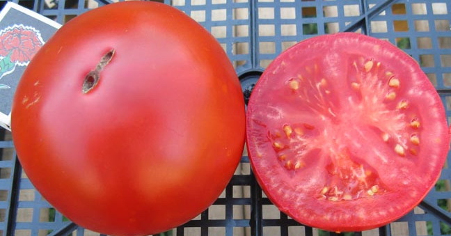 Плоды красные, плоско-округлые, идеально гладкие без пятен, трещин, с отменной урожайностью. Масса плодов около 300 г. Кусты высотой до 1,8 м.