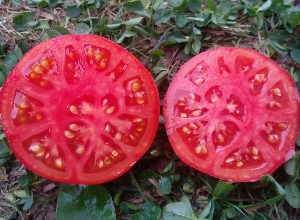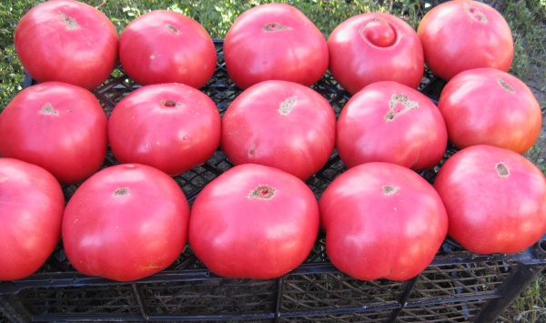 Плоды идеально ровные, розового цвета, плоско-округлые, сахаристые, мясистые, сладкие, десертного вкуса. Масса плодов до 500 г, некоторые плоды могут достигать массы 800 г. Высокорослый сорт среднего срока созревания. Кусты высотой около 1,5 м. По урожайности занял первое место среди гигантов.