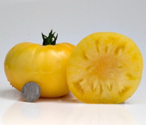 Плоды сладкие и невероятно сочные, плоско-округлой формы, при созревании желтые - не становятся оранжевыми, как большинство желтых сортов. Масса плодов 600-900 г. Сорт среднего срока созревания. Кусты высотой около 1,80 м.