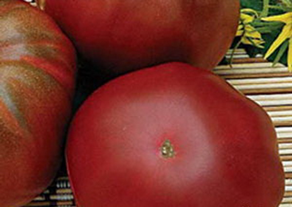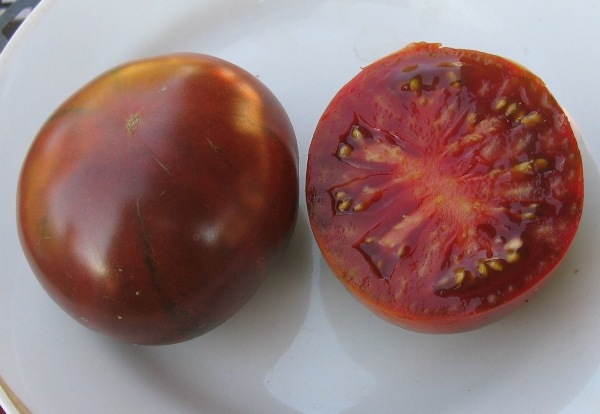 Плоды слабо плоские, округлые или слегка овальные, шоколадного цвета, ароматные и сладкие. Масса плодов около 300 г. Кусты высотой около 1,5 м, очень урожайные.