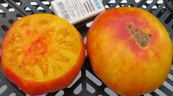 Плоды оранжевые с розовыми разводами и пятнышками, красивые и вкусные, массой до 600 г. Сорт среднего срока созревания. Кусты высотой до 1,20 м.
