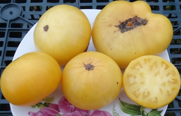Плоды желтые, часто с розовой верхушкой и красивыми розовыми лучами к низу, имеют прекрасный вкус. Масса плодов от 200 г и более. Сорт среднего срока созревания. Кусты высотой до 1 м с суперкартофельными листьями.