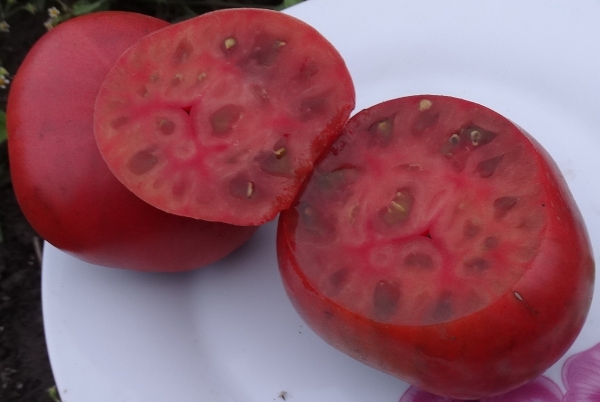 Плоды необычно насыщенного красного цвета, с фиолетовым оттенком, плоско-округлые, прекрасного вкуса. Хорошо подходят и для сока, и для консервирования. Масса плодов от 150 г и больше. Сорт среднего срока созревания. Кусты высотой до 60 см.