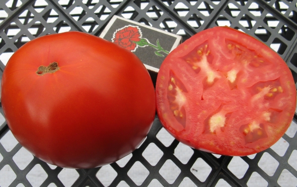 Плоды красные, округлые, мясистые, упругие, без пятен и трещин. Идеальные для рынка. Сорт среднего срока созревания. Кусты высотой до 1,8 м. Масса плодов около 200 г.