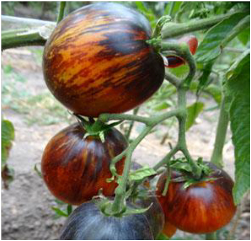 Плоды не крупные, но очень красивые: при созревании их окраска меняется с зелено-фиолетовой на красно-коричнево-фиолетовую. Масса плодов - 50 - 100 г. На вкус сладкие с кислинкой. Среднерослый, среднеранний, урожайный сорт. Кусты компактные, высотой до 1,4 м.